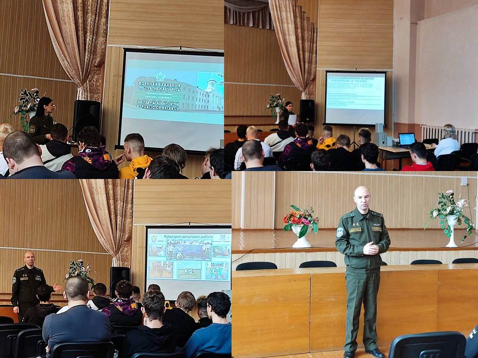 25.11.2022С целью патриотического воспитания подрастающего поколения и в рамках проведения профориентационной работы с учащимися выпускных учебных групп 25 ноября состоялся открытый диалог с военнослужащими УО «Белорусская государственная академия авиации» и УО «Военная академия Республики Беларусь». Подполковник Тищенко Тарас Анатольевич познакомил ребят с военным факультетом академии авиации, специальностях, специфике обучения. Рассказал о культурно-досуговой жизни курсантов, о денежном довольствии во время обучения, правилах поступления.