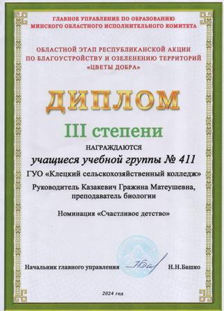 23.09.2024Подведены итоги областного этапа республиканской акции по благоустройству и озеленению территорий "Цветы добра". Творческий коллектив учащихся 411 учебной группы награжден Дипломом 3 степени в номинации "Счастливое детство". Поздравляем ребят и их руководителя Казакевич Гражину Матеушевну, преподавателя биологии. Желаем им творческих успехов в дальнейшем!