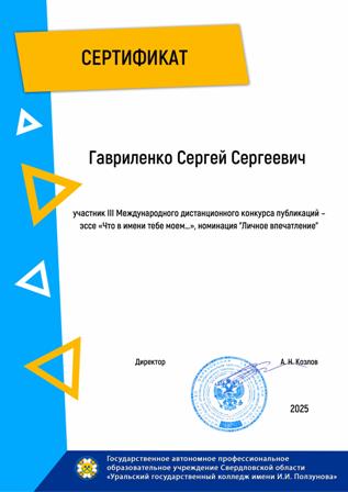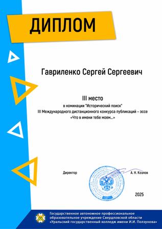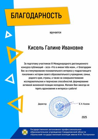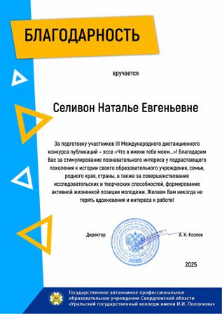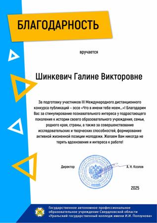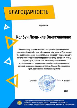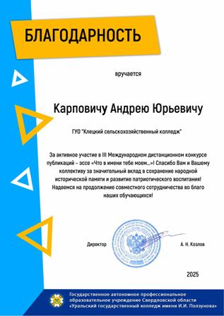 Государственное автономное профессиональное образовательное учреждение Свердловской области «Уральский государственный колледж имени И.И.Ползунова» выразило благодарность директору нашего колледжа Карповичу Андрею Юрьевичу за сотрудничество и развитие патриотического воспитания!