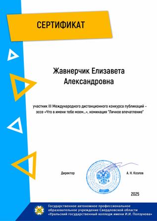 22.05.2025Завершился III Международный дистанционный конкурс на лучшую публикацию-эссе «Что в имени тебе моём…» среди образовательных организаций среднего профессионального образования!